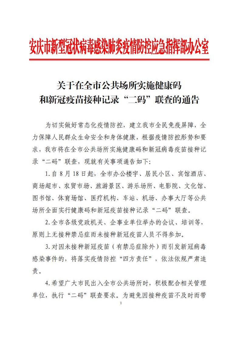 当前位置: 网站首页 >> 宜秀新闻 > 关于在全市公共场所实施健康码和新冠疫苗接种记录“二码”联查的通告 来源:宜秀新闻网 时间:2021-08-23 08:18:15 点击率: 字体:大号 中号 小号 打印 上一篇:安庆市新型冠状病毒感染的肺炎疫情防控应急指挥部发布最新通告! 下一篇:花家红、吴曙一行赴浙江省乐清市实地参观考察人民控股集团