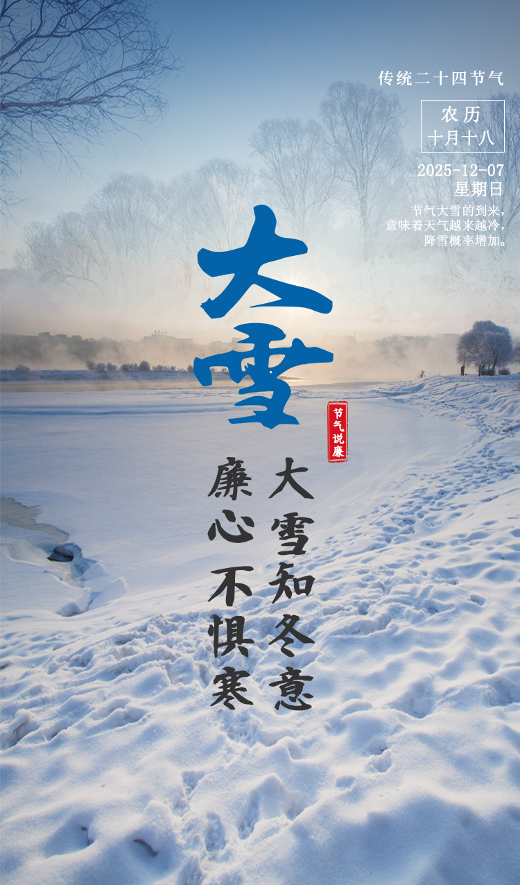 当前位置: 网站首页 >> 廉政文化 > 节气说廉 | 大雪知冬意 廉心不惧寒 来源: 时间:2025-12-07 09:35:00 点击率: 字体:大号 中号 小号 打印 上一篇:节气说廉 | 立冬:冬始万物藏 廉洁守初心 下一篇:最后一页